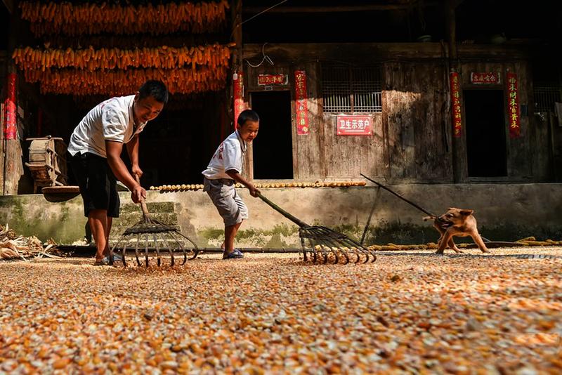 贵州省铜仁市松桃苗族自治县近日进入玉米成熟采收时节,当地村民抢抓晴好天气,采收、晾晒玉米,处处呈现出丰收繁忙的景象。