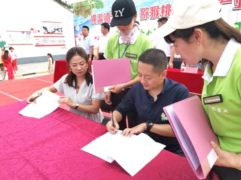 2019年8月19日上午,宝鸡市眉县横渠镇2019·猕猴桃推介暨产业脱贫表彰大会在中国猕猴桃第一村——横渠镇文谢村成功举办。“中亿锦园”猕猴桃生产基地项目负责人景俊荣与果农代表依次签订2019年猕猴桃生产收购合同,为果农脱贫再添力。