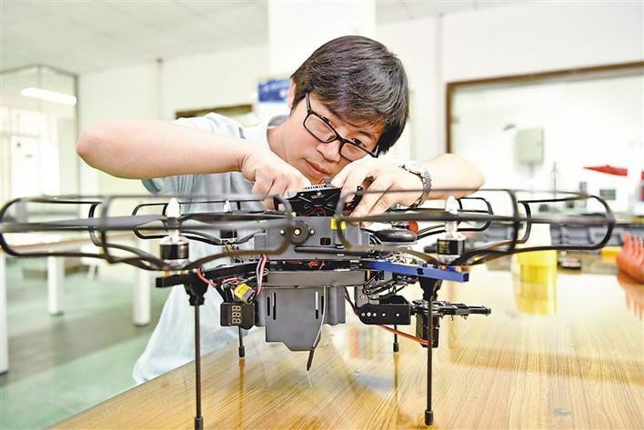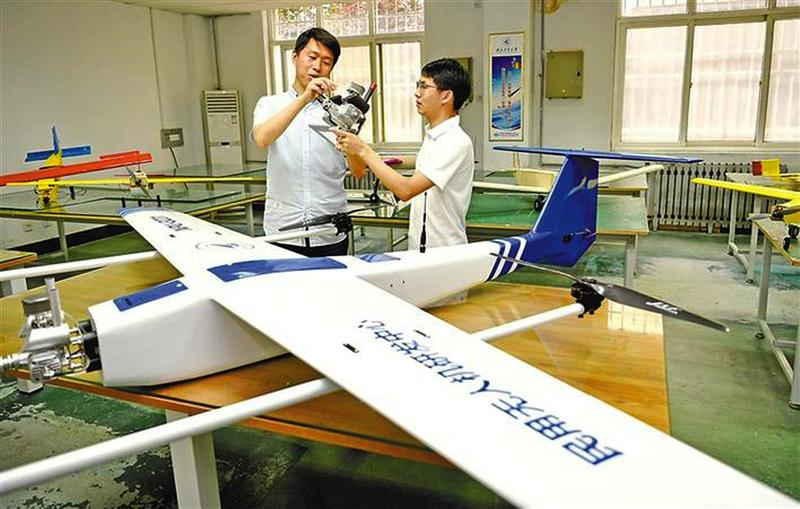 西北工业大学民用无人机研发中心依托西北工业大学20余支科研团队,针对民用无人机飞控、数据链、地面站、载荷等关键技术进行研发。目前,中心所研发的无人机系列产品应用在国土巡查、环境监测、人工增雨、管道巡检等领域,可满足长航时、高海拔、恶劣气候条件下的作业需求,受到国内外市场青睐。图为工作人员正在调试无人机发动机电喷总成系统。