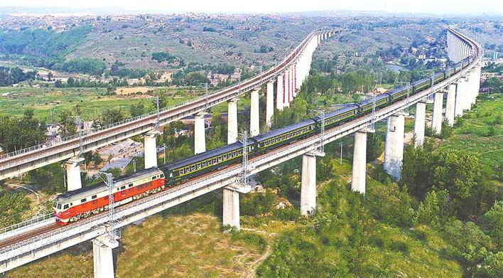新中国成立后,榆林在较长的时间里与黄土高原、窑洞、毛乌素沙漠、缺水、风沙大等概念连在一起。乘着改革开放的春风,榆林经济社会各项事业迅猛发展,富集的能源资源让工业成为主导产业,四通八达的路网让交通更加便捷,昔日的沙漠披上了绿装,群众的可支配收入不断增长……图为榆林开往西安的客运列车驶过归德堡铁路大桥。