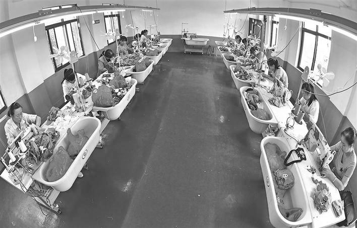 今年5月,由陕西长庚汇鑫集团与江苏省南京市开平工艺玩具厂共同投资500万元建设的陕西长庚兴工艺品有限公司正式投产,百余名贫困群众在短短3个月生产出毛绒玩具7万多个,订单收入10多万元,每个劳动群众月收入达1500元。图为贫困群众在陕西长庚兴工艺品有限公司缝纫车间作业。