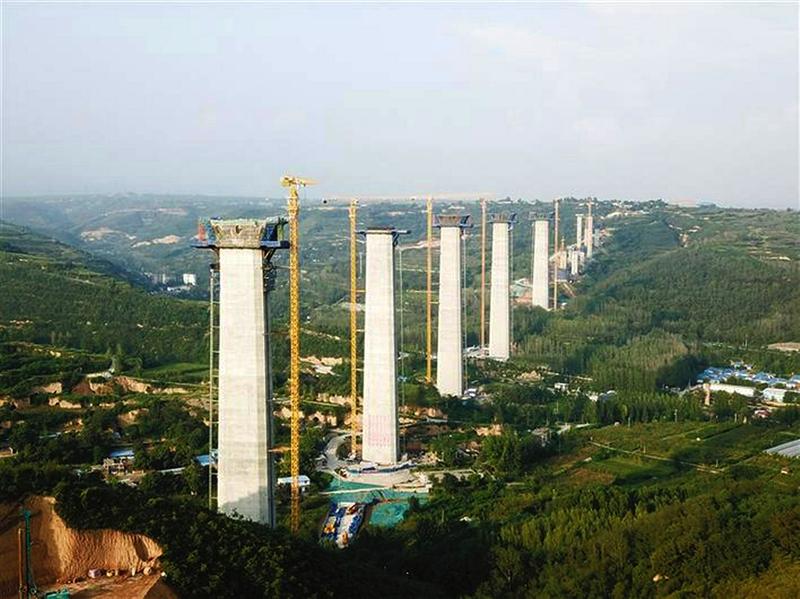 在菏宝高速公路铜川段,多座联跨大桥正在紧张浇筑中,现场建设如火如荼。菏宝高速,即菏泽—宝鸡高速公路,是国家G35济广高速的联络线,起点在山东省菏泽市,经过山东、河南、山西、陕西4省,终点在陕西省宝鸡市。图为目前世界联跨长度第一的菏宝高速王家河大桥正在进行大桥桥墩的最后浇筑,其中最高一根桥墩为140米。