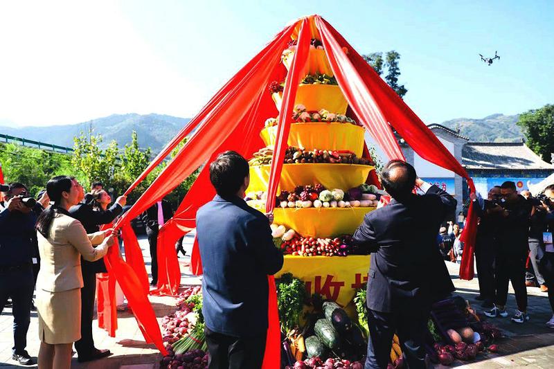 上午,丹凤县棣花古镇人头攒动,热闹非凡,商洛市2019年“中国农民丰收节”启动。启动仪式上,与会领导和农民代表共同为丰收节“丰收塔”揭幕。
