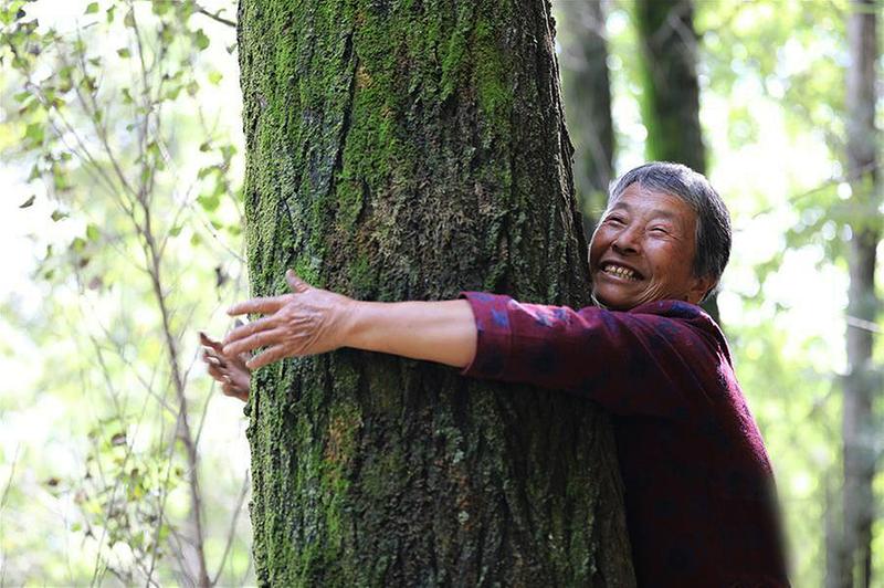 9月20日,张莲莲抱着当年自己栽种的小树苗长成的参天大树。都红刚 摄