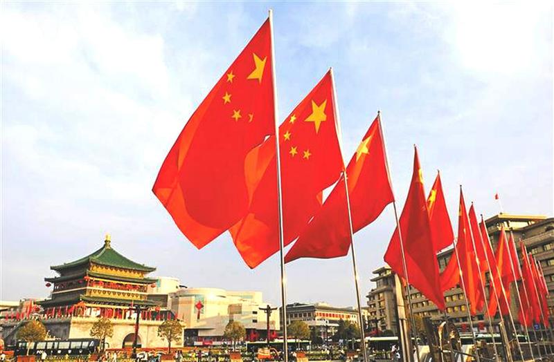 9月24日,在西安街头、广场、巷道,五星红旗迎风飘扬,人们用升挂国旗的方式,喜迎新中国成立七十周年。