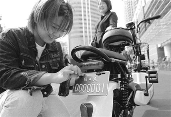 启动仪式上,交警部门向市民发放了第一批多个式样的电动自行车号牌。其中,首张合标电动自行车号牌为蓝底白字的陕A0000001。
