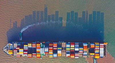 10月4日,一艘满载集装箱的货轮缓缓驶离上海洋山深水港码头。船身与装载的集装箱倒影映照在东海海面上,犹如鳞次栉比的城市楼宇,错落有致。货轮航行在东海海面,仿佛一座移动的“海上城市”。
