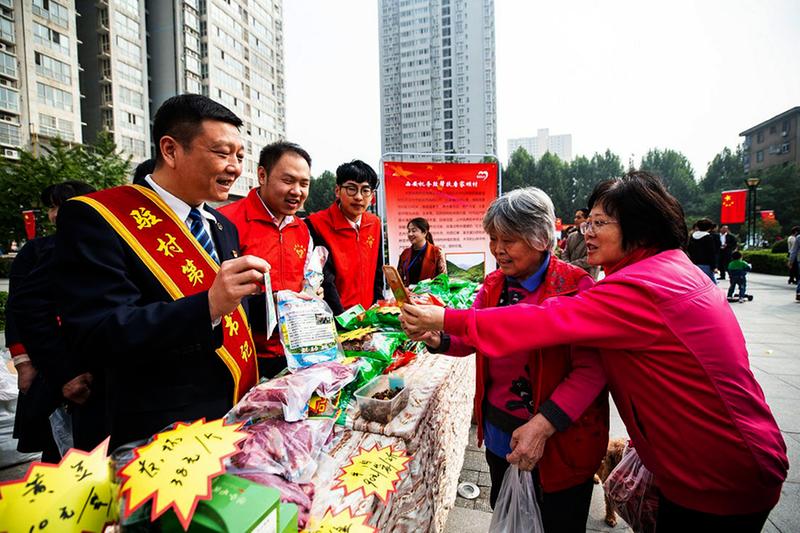 10月13日上午,西安南郊铁路社区“火车头”体育馆广场人来人往、热闹非凡,“消费扶贫直通车”的横幅分外醒目,来自陕西汉中勉县4个镇8个村和商洛市1区2县的木耳、蜂蜜、牛肉、茶叶、香菇等产品琳琅满目,由中国铁路西安局集团有限公司组织开展的“消费扶贫直通车”活动正在火热进行。