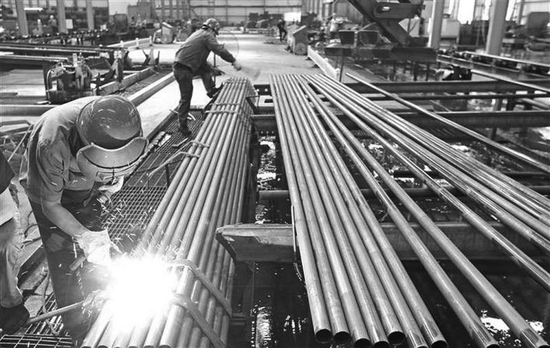陕西轩文实业有限公司是西北地区最大的架管和集成房屋生产企业,年产架管15万吨,钢结构5万吨,集成房屋1万余套。图为工人在生产车间对钢管进行成型打包。
