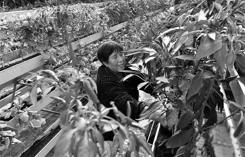近年来,陕西省渭南市华州区不断加大农业产业结构调整力度,加强新型农业经营体系建设,大力推进高效设施农业,走规模化种植绿色无公害蔬菜道路,促进群众增收。目前,该区共发展设施蔬菜13.21万亩,年产值近5亿元。图为工人在打理无土栽培辣椒。