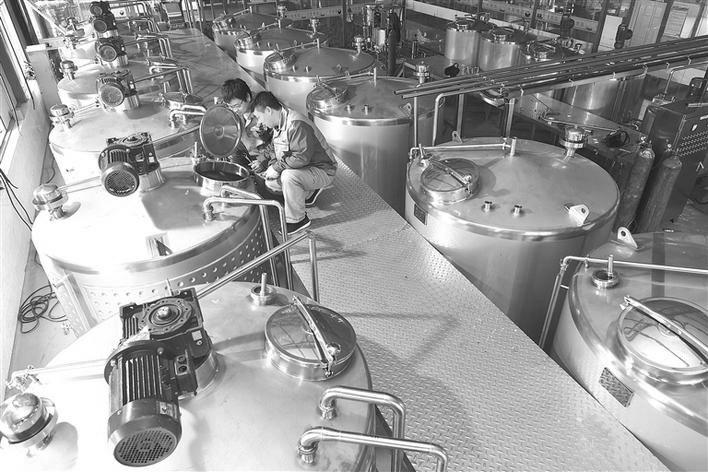 安康市岚皋县红岩寨农业开发有限公司通过土地流转、园区务工等形式,解决了当地果农鲜果销售问题,有效带动农户增收。据悉,该企业年可生产果酒250吨,实现产值1500万元。图为在酿酒生产车间,工人正在安装新购进果酒生产线设备。