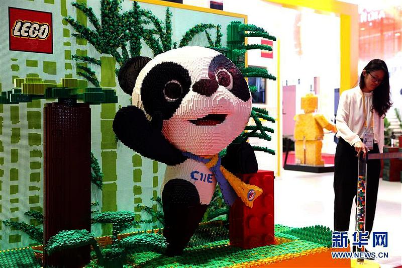 用积木搭成的进博会吉祥物熊猫“进宝”