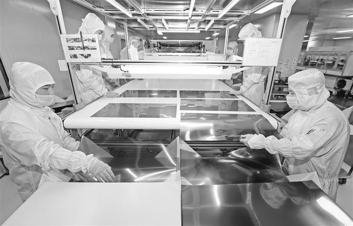 咸阳冠石科技有限公司致力于半导体及显示行业功能性器件、偏光片的生产与销售,主要为彩虹光电配套生产偏光片产品,今年销售额预计2.5亿元。图为工人在生产线上收料。