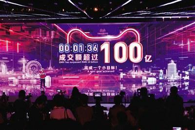 11月11日,在浙江杭州阿里巴巴西溪园区媒体中心,大屏幕显示阿里巴巴旗下天猫“双11”成交额达到100亿元人民币。