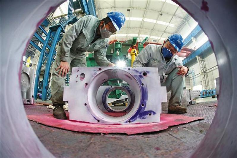中冶陕压重工设备有限公司拥有冶炼、铸造、锻造、热处理、铆焊、机械加工及装配等全流程的生产设备2000多台套,具有年产5万吨机械设备的制造能力。该公司坚持走“专、精、特、新”的发展道路,致力于打造中冶集团“冶金建设国家队”装备制造板块的龙头企业。图为两名技术工人在对锻钢轴承座进行表面渗透探伤。