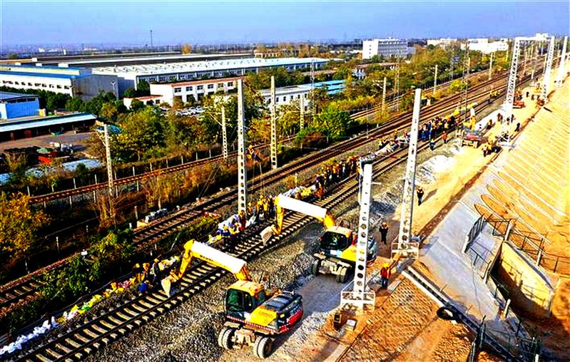 近日,经过中铁七局300余名施工人员3个多小时的连续奋战,西安站改扩建工程新丰站西咽喉成功接入陇海铁路线,为今年年底前西安站改扩建工程新窑线(新丰镇—窑村)的开通提供了保障。图为中铁七局施工人员正在驳接轨道线路。