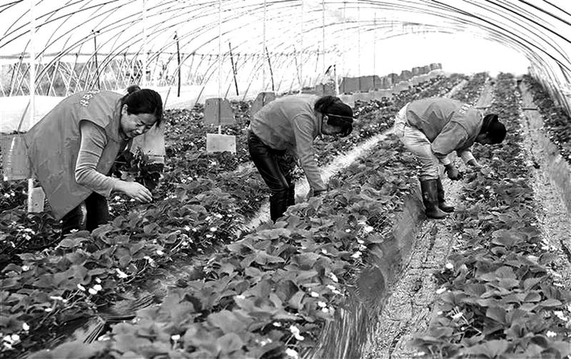 蓝田县的西安绿杰种养专业合作社有钢架草莓大棚57栋,建成400平方米的草莓包装分拣车间和镇级电子商务大厅,已吸纳合作社周边贫困户41户97人。图为工人在草莓大棚里摘除老叶子和匍匐茎。