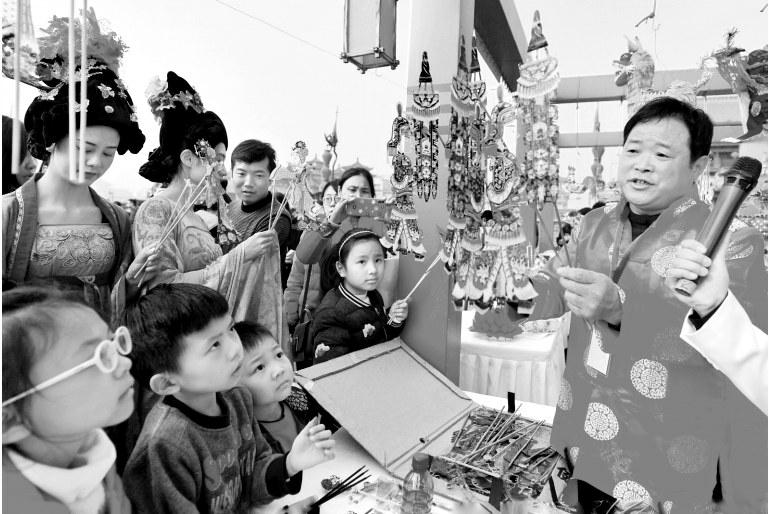近日,西安城墙永宁门里热闹非凡,花灯制作、川剧变脸、剪纸画、木版年画、活字印刷术、扎染、皮影戏、复原唐代铠甲等八项非物质文化遗产项目,吸引了众多市民、游客。大家亲身体验非遗技艺,在欢乐的时光中了解祖国的传统文化,感受“非遗”的独特魅力。图为小游客们向非遗传承人学习操作皮影。