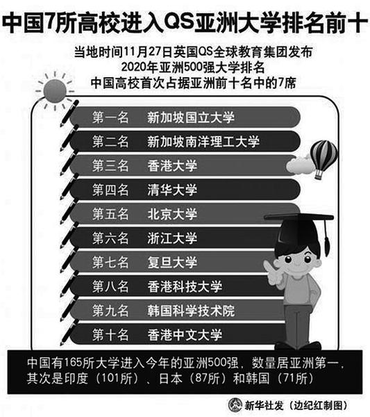 英国QS全球教育集团27日发布2020年亚洲500强大学排名,中国高校首次占据亚洲前十名中的7席.在这次排名榜上,新加坡国立大学、新加坡的南洋理工大学分列第一、第二。排名第三名至第八名的分别为香港大学、清华大学、北京大学、浙江大学、复旦大学、香港科技大学,韩国科学技术院排名第九,香港中文大学排名第十。