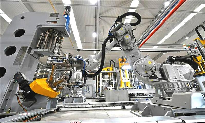 随着“一带一路”建设深入推进,法士特集团先后与多家国际跨国公司建立良好战略合作关系,产品出口美国、日本、澳大利亚、俄罗斯等十多个国家和地区。图为工业机器人在法士特伊顿(宝鸡)轻型变速器生产线上作业。