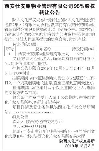 西安仕安朋物业管理有限公司95%股权转让公告