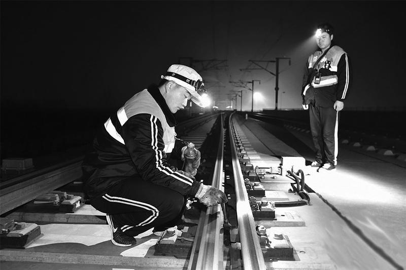 12月2日夜间,在西成高铁的鄠邑站至新场街站间,西安高铁基础设施段鄠邑综合维修车间的职工利用300分钟的“天窗”时间,对西成高铁接触网、道岔、信号等设备,进行集中养护整治,为即将到来的2020年春运做好充分准备。图为职工在接触网作业车的平台上检修接触网设备。