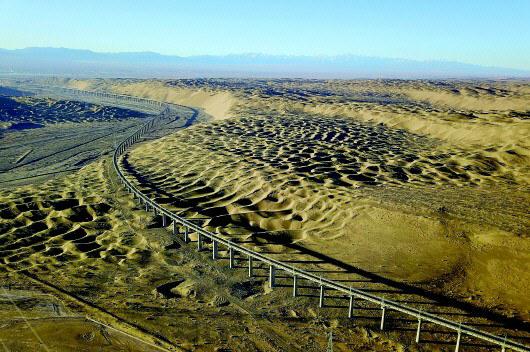 敦格铁路沙山沟特大桥(12月11日无人机拍摄)。敦(煌)格(尔木)铁路沙山沟特大桥位于甘肃省酒泉市阿克塞哈萨克族自治县境内的库姆塔格沙漠内,是一座穿越活动性沙漠地区的特长桥梁,也是敦格铁路的重难点控制工程。据介绍,桥梁所在区域风沙活动频繁,四季及昼夜温差大,在建设过程中,中铁十一局集团有限公司的建设者根据沙层的厚度、分布及含水率的不同,总结出一套沙丘桩基施工工艺。