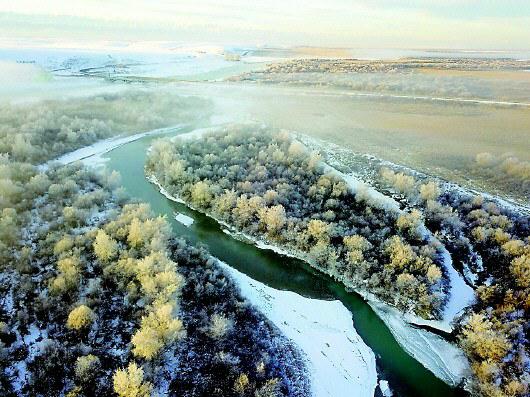 12月13日拍摄的昭苏特克斯河国家湿地公园的雾凇景观。当日,新疆伊犁哈萨克自治州昭苏县出现雾凇景观,宛如仙境。