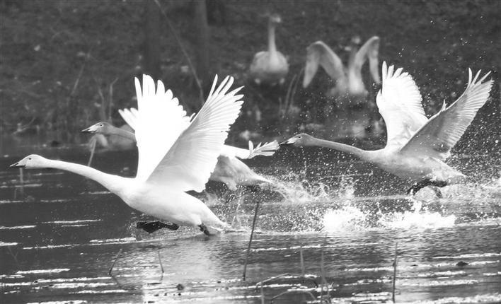 近日,记者在铜川市耀州区小丘镇西部前咀子水库看到,黑鹳、白天鹅、鸳鸯等重点保护动物或在水中游弋觅食,或在空中盘旋飞舞,尤其是前不久飞来越冬的二十五只天鹅更是吸引了西安、咸阳和铜川本地野生动物摄影爱好者前来拍摄。近年来,耀州区持续加强生态修复工作,区域内环境已明显改善,越来越多的野生动物在此越冬。