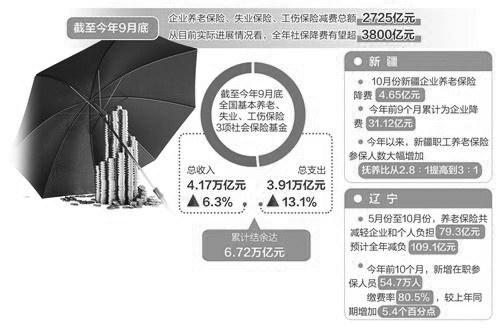 数据显示,10月份新疆企业养老保险降费4.65亿元,今年前9个月累计为企业降费31.12亿元。5月份至10月份,通过降低社保费率和调整缴费基数,辽宁省养老保险共减轻企业和个人负担79.3亿元,预计全年减负109.1亿元。