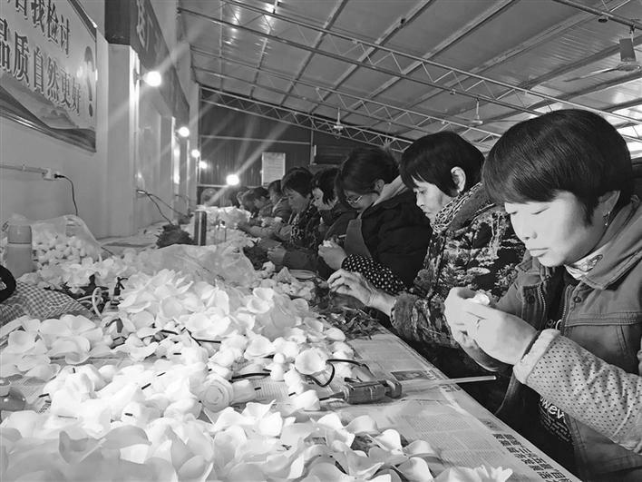 近年来,扶风县按照“送厂子进村子,送岗位进农户”思路,打造“闲房变厂房、农民变工人、无业变就业”就业扶贫新模式,有效推进贫困劳动力“村内生活、村内就业”,实现就近就便、家门口就业的扶贫新路子。截至目前,该县累计发展培育村镇工厂55家,覆盖8个镇街,吸纳就业1823人,其中贫困劳动力就业423人。图为50余位妇女正熟练地制作着仿真花。