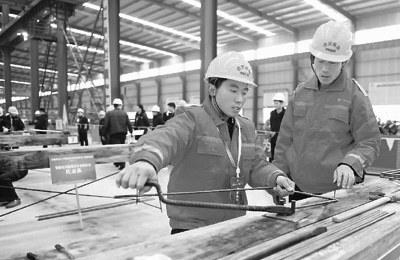 12月23日,安徽省重点工程建筑行业首届农民工技能竞赛在合肥举行,来自全省建筑行业的电焊工、钢筋工在各自项目上各展绝活、比拼技能。图为参赛工人在钢筋工项目中比拼。
