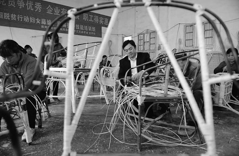 十一月二十九日,南郑区黄官镇良顺藤编公司工人正在编织藤椅。黄官镇具有悠久的藤编历史,产品销售到全国各地,有的还销往加拿大、美国、英国等。