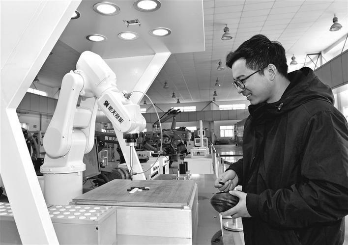近年来,西安航天精密机电研究所坚持自主研发,创建了航天“赛能”品牌,先后攻克了工业机器人多项关键技术,形成了从工业机器人伺服电机、驱动器等核心部件到自动化生产线、智能制造整体解决方案的全产业链发展模式。研究所研发制造的机器人及智能工厂自动化产品覆盖了航天、航空、兵器、教育等领域。图为西安航天精密机电研究所的技术人员与一款搭载智能视觉系统的五子棋机器人下棋。