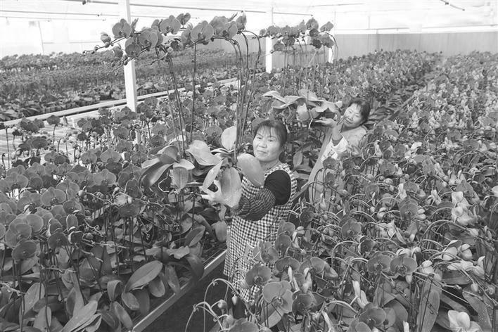 蓝田县西安远晖花卉生产繁育基地27个品种7万多株蝴蝶兰,供应西安春节市场,满足大家对花卉的需求,增添节日的喜庆气氛。图为两位工人在温暖如春的大棚里转运蝴蝶兰。