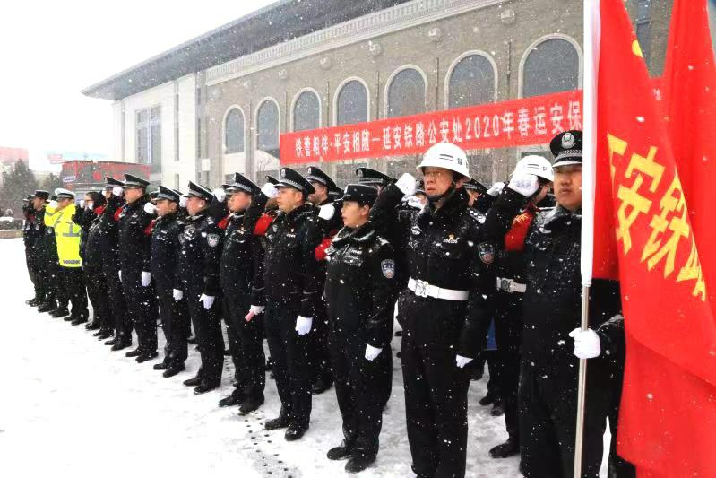 1月9日,在革命圣地延安火车站,西安铁路公安局延安公安处冒着大雪举行“铁警相伴·平安相随”——2020年春运安保启动仪式。延安铁路公安处党委班子成员、机关各部门及治安、刑侦、反恐、安检、特警、交管等支队和延安站派出所共70余名干部民警参加了启动仪式。