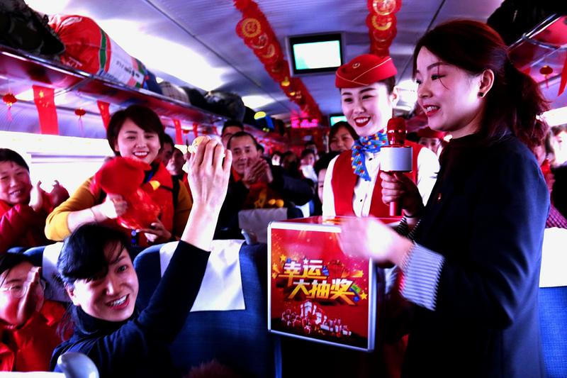 上午11点03分,列车驶离西安。专列上,专门为农民工准备了美味的免费午餐和饮品,更有志愿者们为农民工献上了精心准备的文艺演出,男声独唱《平凡之路》;快板《同仁堂》;相声《学满语》;女声独唱《在希望的田野上》;男女声合唱《常回家看看》;双人舞蹈《涟漪》;快闪舞蹈《美丽的萨日朗》等,车厢里充满了浓浓的年味和暖暖的真情……