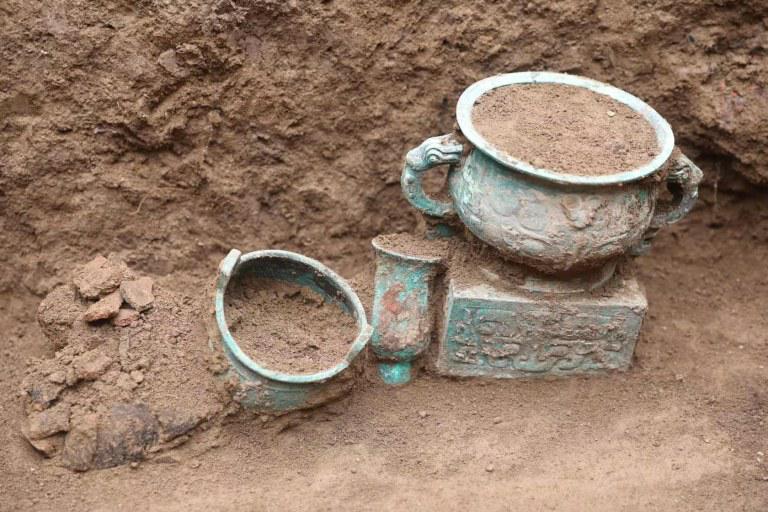 旭光墓地位于秦岭北麓向北延伸的大塬上台原脚下,东临沙河,西南距高铁宝鸡南站仅600米,隔渭河与斗鸡台相望,西距石鼓山约5公里。“此次发掘的西周墓葬形制均为竖穴土坑墓,南北向,其中4座墓呈‘一’字排列,整齐有序。西周墓葬均随葬青铜器,一般为一鼎一簋一觯。”宝鸡市考古研究所所长辛怡华说,“战国墓葬均为竖穴土坑墓,随葬陶器多为一罐一鬲一盂。”