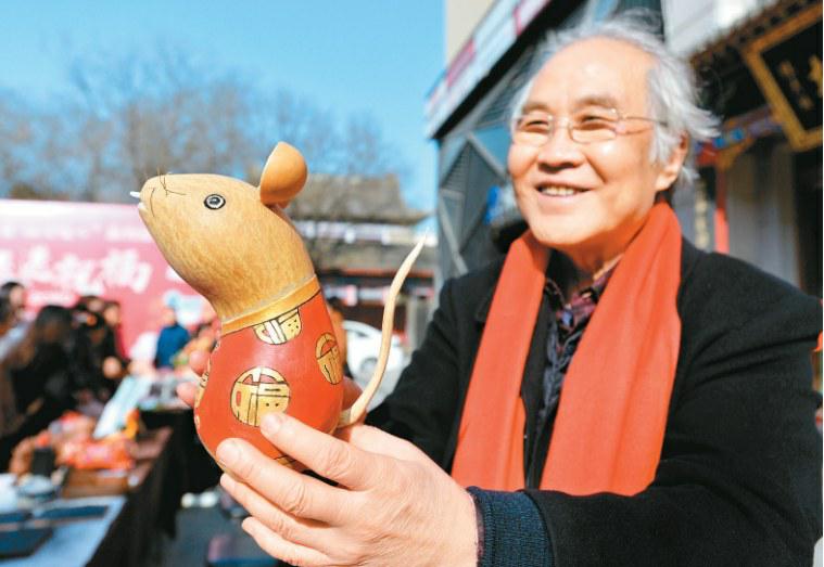1月20日,西安市碑林区“暖冬有爱·温情暖心”活动在南院门街道举行,工作人员为千余名困难群众送去了慰问品和共50余万元的慰问金,现场还有捏面人、剪窗花、做花馍、手绘关中葫芦等精彩的非遗展演,辖区群众倍感“暖冬有爱”、年味浓浓。图为关中葫芦制作技艺传承人梁平安展示手工制作的“葫芦鼠”。