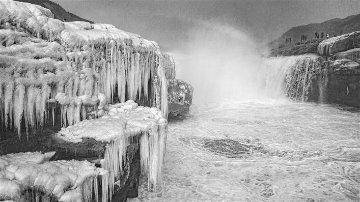 近日,在位于宜川县的陕西黄河壶口瀑布景区,壶口瀑布两岸冰凌素裹,黄河水夹杂着流凌沿着河槽飞流而下,溅起的水雾高达30多米,形成了“水底冒烟”的独特景观。