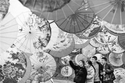 1月20日,游客在樱花庄园观赏油纸伞风情展。蒋克青 摄