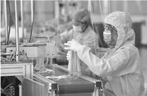 1月29日,西安住邦无纺布制品有限公司员工在制作口罩。为助力抗击新型冠状病毒感染的肺炎疫情,西安市十家生产防护消毒用品企业紧急召回、招聘员工,满负荷生产,以保障口罩、消毒液等防护消毒用品的稳定供给。刘潇 摄 阻击疫情,物资先行。连日来,面对疫情防控的严峻形势,陕西省采取多种举措,相关医疗物资生产企业积极复工复产,与时间赛跑、与病毒斗争,尽最大努力保障医疗防控物资供应,为打赢疫情防控阻击战提供坚强保障。