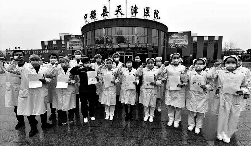 新型冠状病毒感染的肺炎疫情发生以来,陕西省汉中市宁强县天津医院医护人员纷纷递交“请战书”,志愿到隔离区一线投入工作。截至1月30日下午,该院共有106名医护人员主动申请前往抗击疫情的前线。宁强县天津医院是陕西省新型冠状病毒感染的肺炎第一批定点医院。图为1月31日,陕西省汉中市宁强县天津医院递交“请战书”的部分医护人员宣誓“面对疫情要用爱心守护患者健康”。