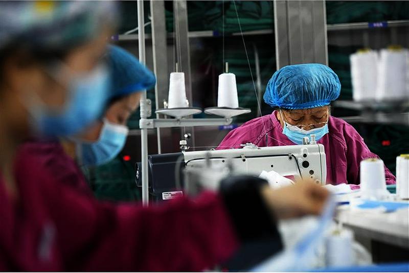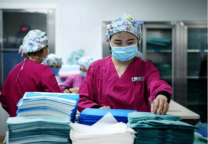 近日,在西安交通大学第二附属医院消毒供应中心,30余名医护人员和志愿者利用医用包装无纺布、器械用吸水纸、N95熔喷过滤布等材料动手制作口罩。经过不断改进,目前口罩日产量可达到500余只。自制口罩经陕西省医疗器械质量监督检验部门检测合格后,将在口罩紧缺期间用于医院的应急物资储备。图为护士参与制作口罩。