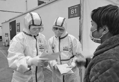 武汉客厅“方舱医院”里,医护人员正在登记患者的相关信息。李晗 摄 2月9日晚上,在武汉客厅“方舱医院”,已经连续工作了4天的周俊辉又开始了新一轮忙碌。按照武汉市防疫指挥部部署,武汉正集中落实“四类人员”分类集中管理措施,一批批确诊轻症患者被连夜送来。