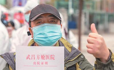 图2:2月11日下午,武汉武昌方舱医院,首批患者康复出院。张武军 摄