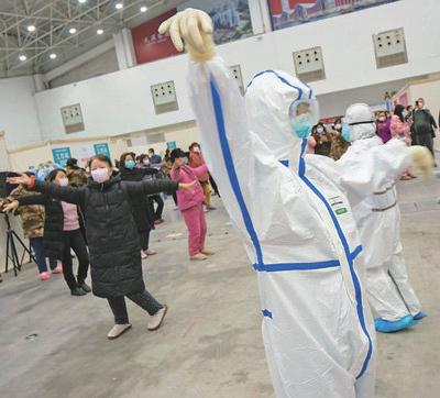 图1:2月10日,武汉客厅方舱医院,患者在医护人员的带领下跳舞。熊琦 摄