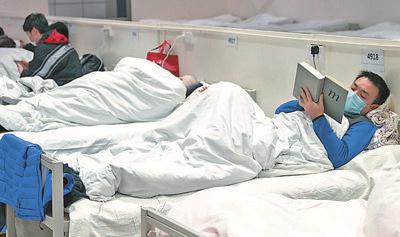 图8:2月5日,在武汉江汉方舱医院,一名患者在床上看书。熊琦 摄