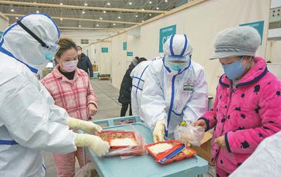 图7:2月10日,在武汉客厅方舱医院,医护人员在分发餐食。熊琦 摄