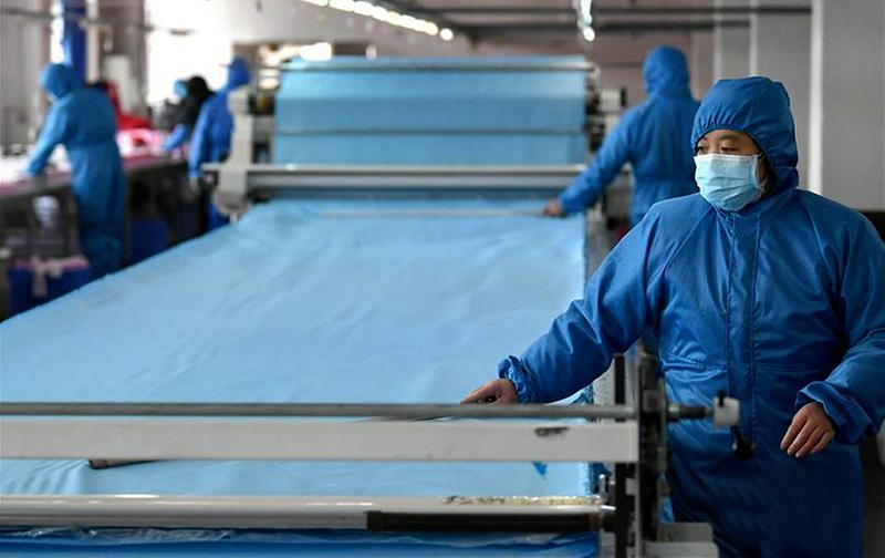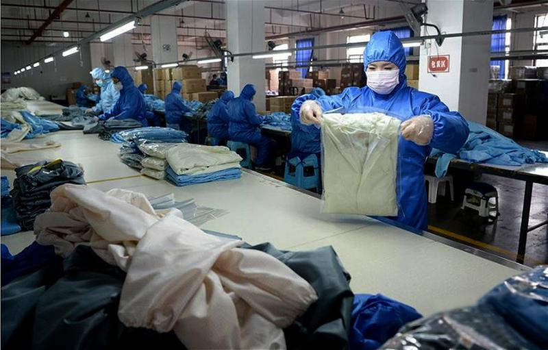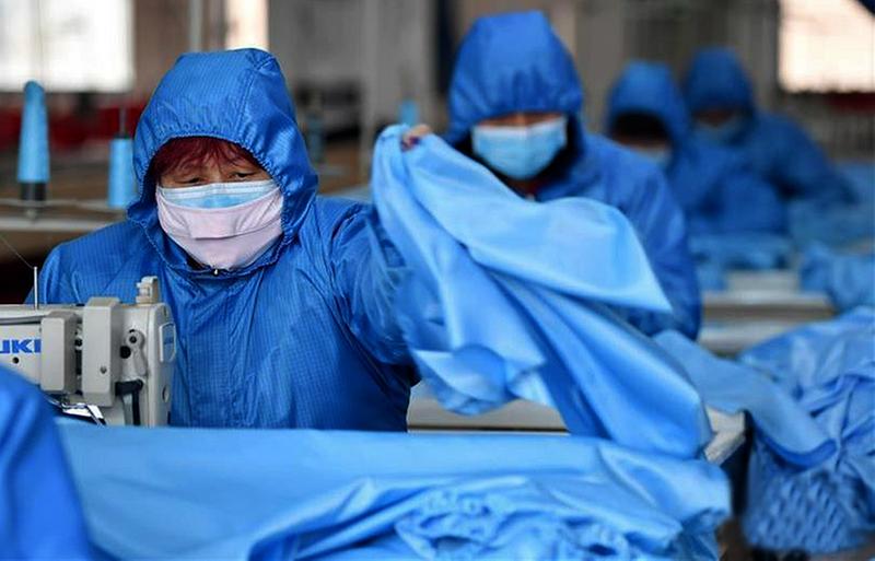 为确保一线医务人员防护服的正常供应,西安企业转产保障防疫物资。图为工人在隔离服生产线上工作。